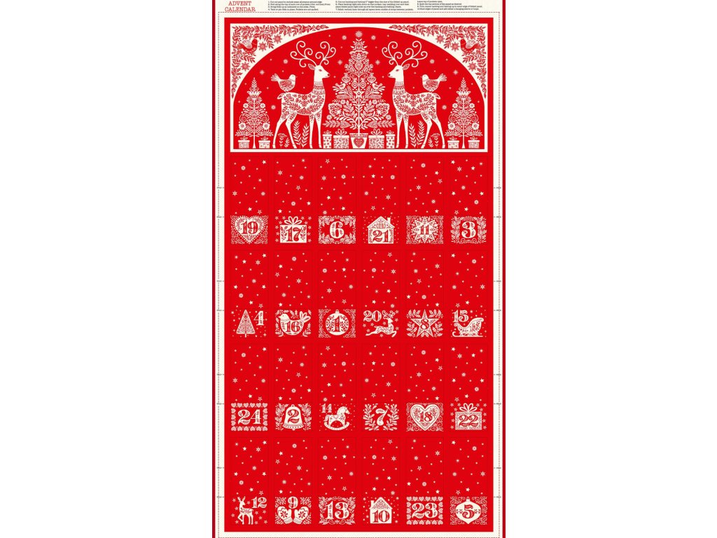 Adventní kalendář k ušití s vánočním skandinávským motivem, vzor jeleni, ptáčci a vánoční folklorní motivy na červeném podkladu .