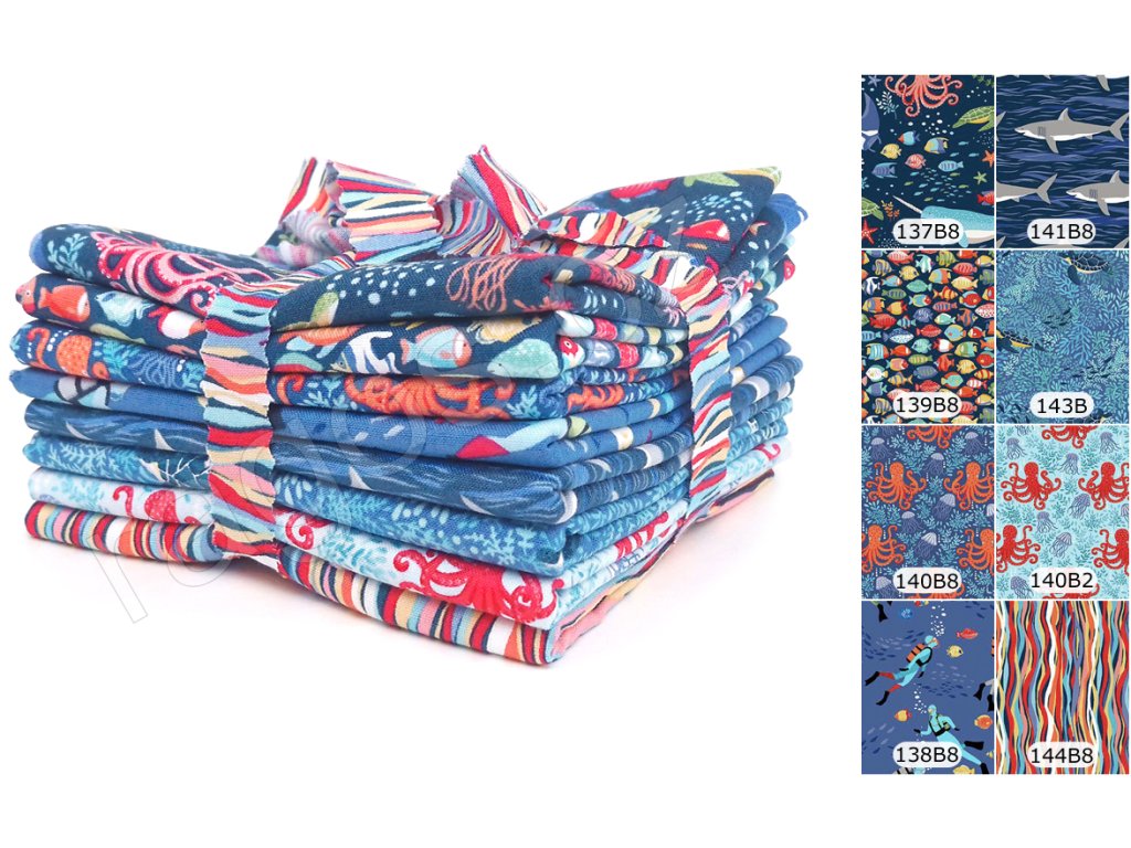 Fat Quarter - 8x 50x55cm = celkem 2 metry látky s mořským motivem v tmavě modrých odstínech z kolekce Deep Blue See. Cena za balení. 100% bavlna.
