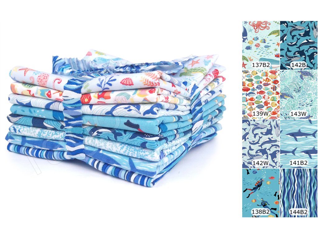 Fat Quarter - 8x 50x55cm = celkem 2 metry látky s mořským motivem ve světle modrých odstínech z kolekce Deep Blue See. Cena za balení. 100% bavlna.
