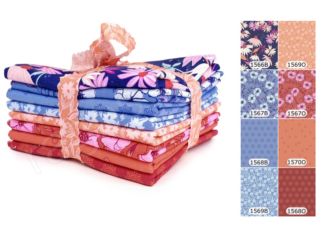 Fat Quarter - 8x 50x55cm = celkem 2 metry látky s motivem květin v modrých a oranžových odstínech z kolekce Petals and Stitches. Cena za balení. 100% bavlna.