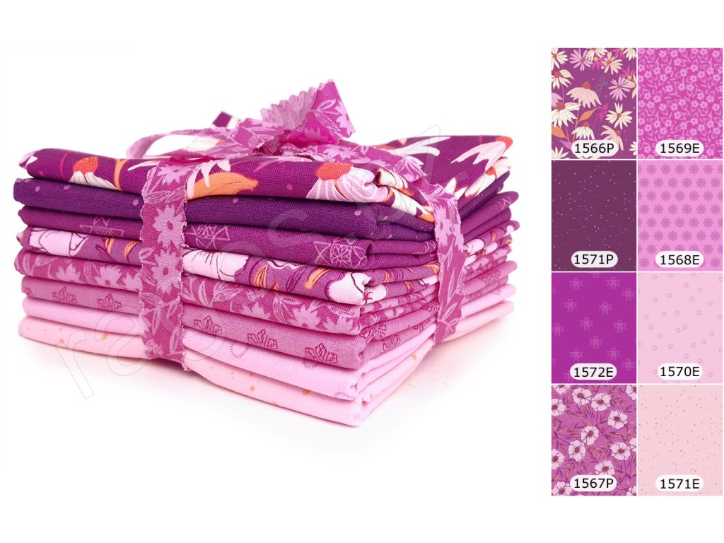 Fat Quarter - 8x 50x55cm = celkem 2 metry látky s motivem květin ve fialových a růžových odstínech z kolekce Petals and Stitches. Cena za balení. 100% bavlna.