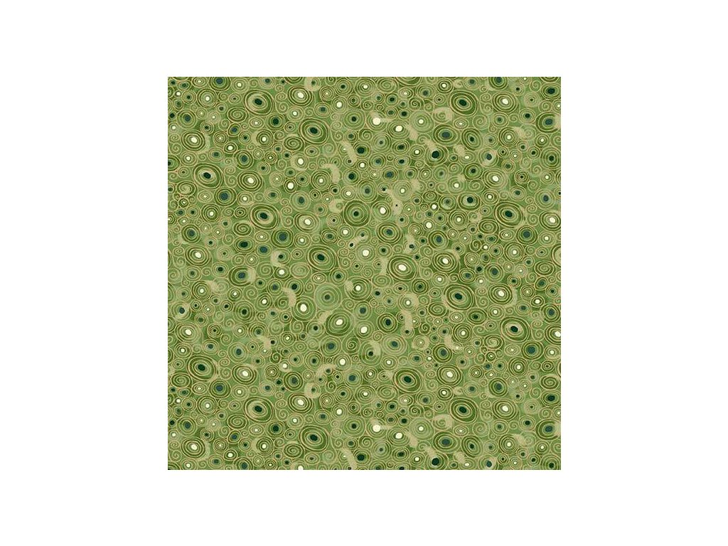 Látka s geometrickým motivem, vzor scroll se zlatým efektem na zeleném podkladu.