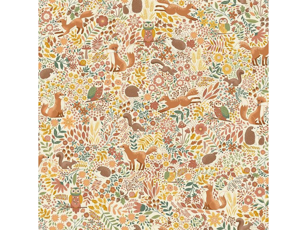 Látka s podzimním motivem, vzor lesní zvířátka v přírodě na smetanovém podkladu.