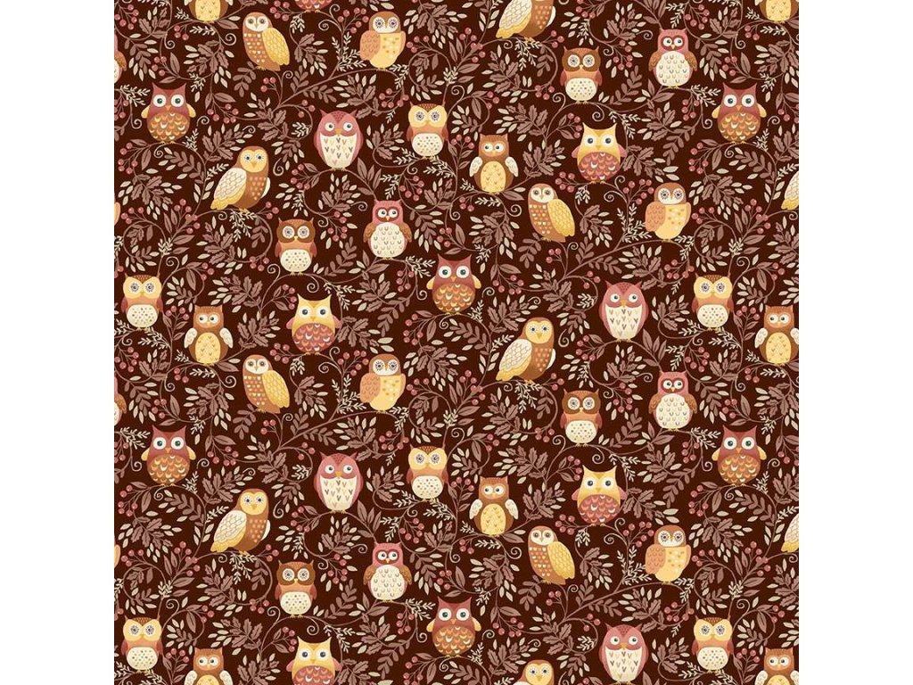 Látka s podzimním motivem, vzor sovy na hnědém podkladu.
