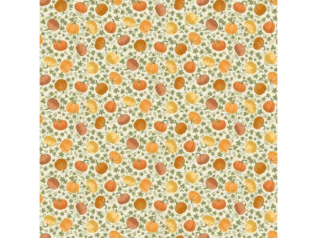 Látka s podzimním motivem, vzor dýně na smetanovém podkladu.