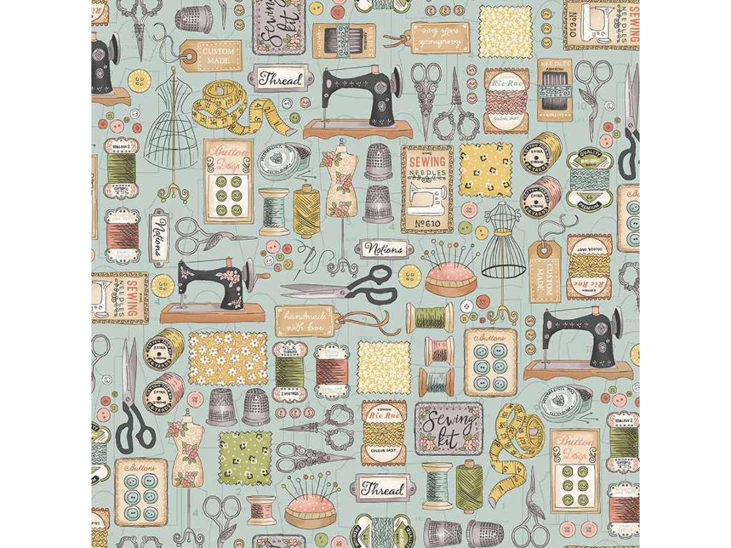 Látka s motivem šití, vzor šicí potřeby na světle tyrkysovém podkladu.