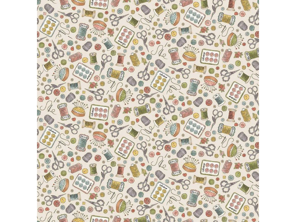 Látka s motivem šití, vzor šicí potřeby na smetanovém podkladu.
