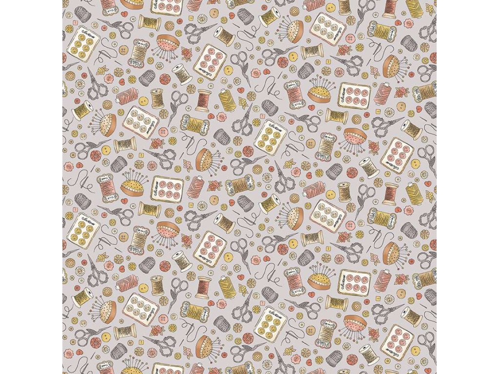 Látka s motivem šití, vzor šicí potřeby na světle šedém podkladu.