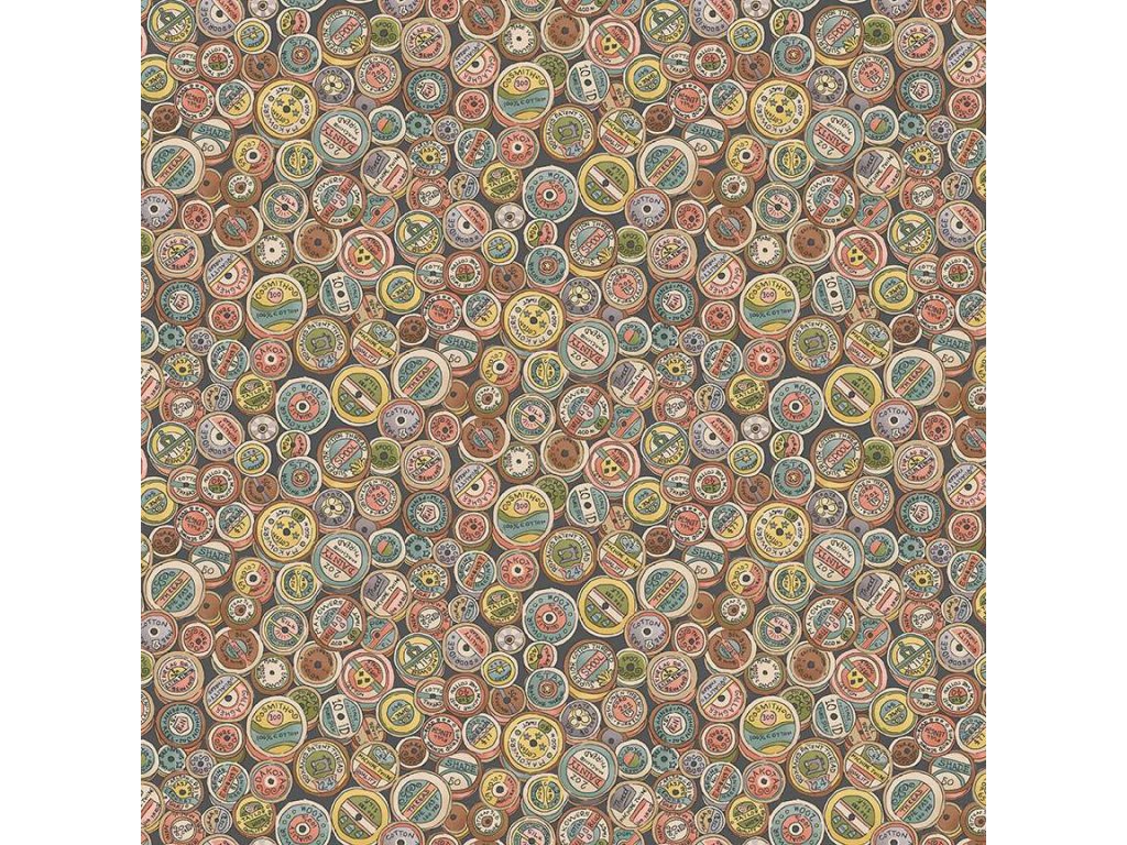 Látka s motivem šití, vzor špulky nití na šedo fialovém podkladu.
