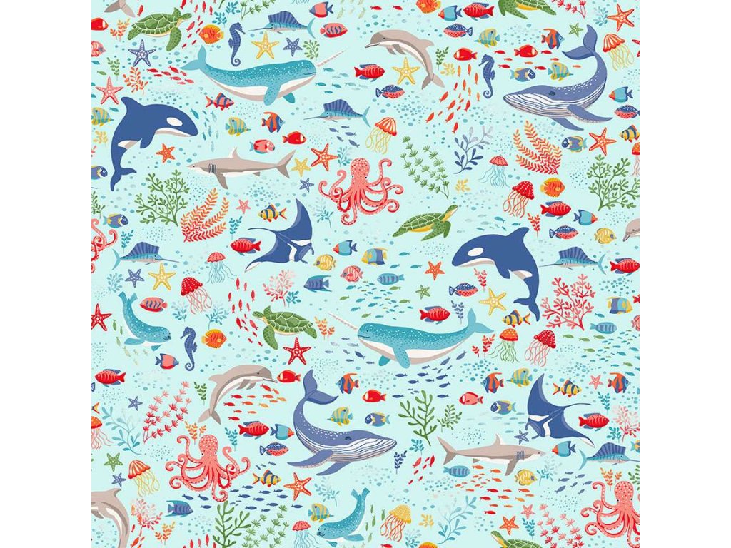Látka s mořským motivem, vzor mořští živočichové na světle modrém podkladu.