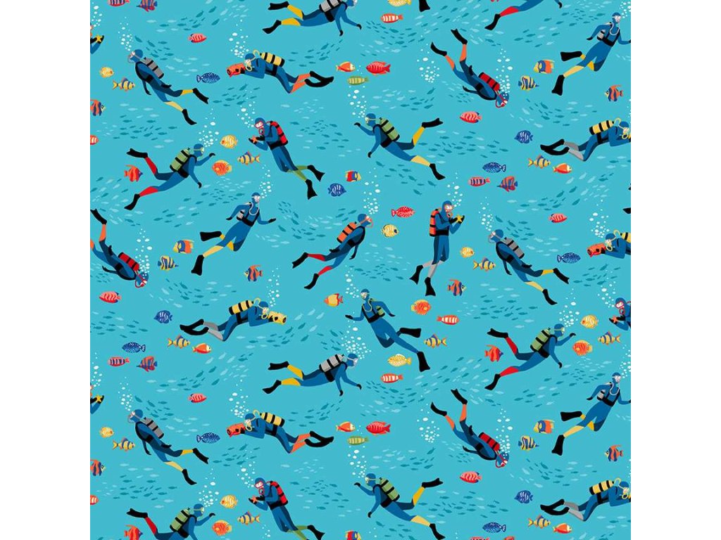 Látka s mořským motivem, vzor ryby a potápěči na světle modrém podkladu.