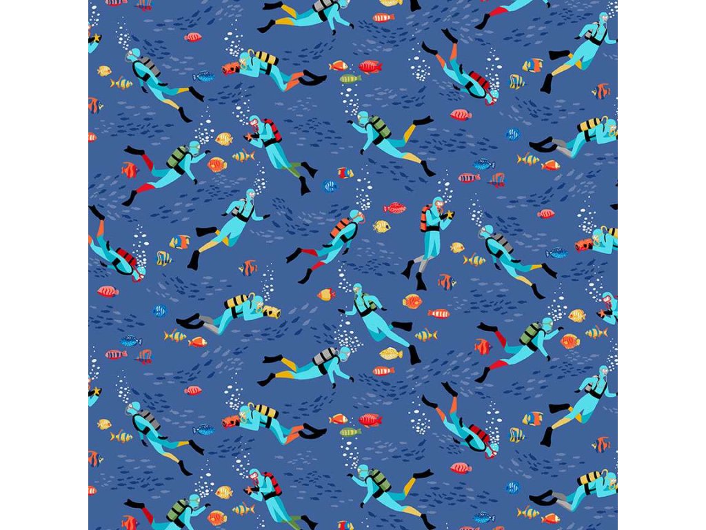 Látka s mořským motivem, vzor ryby a potápěči na modrém podkladu.