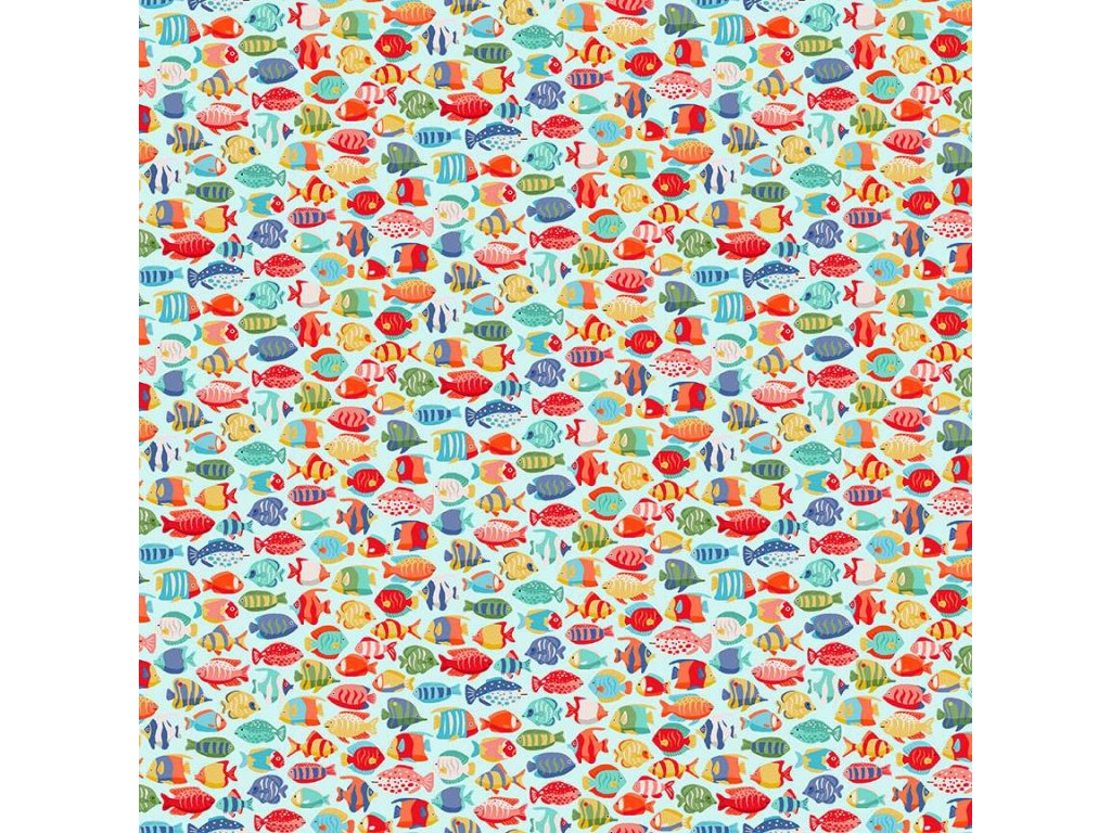 Látka s mořským motivem, vzor barevné ryby na světle modrém podkladu.