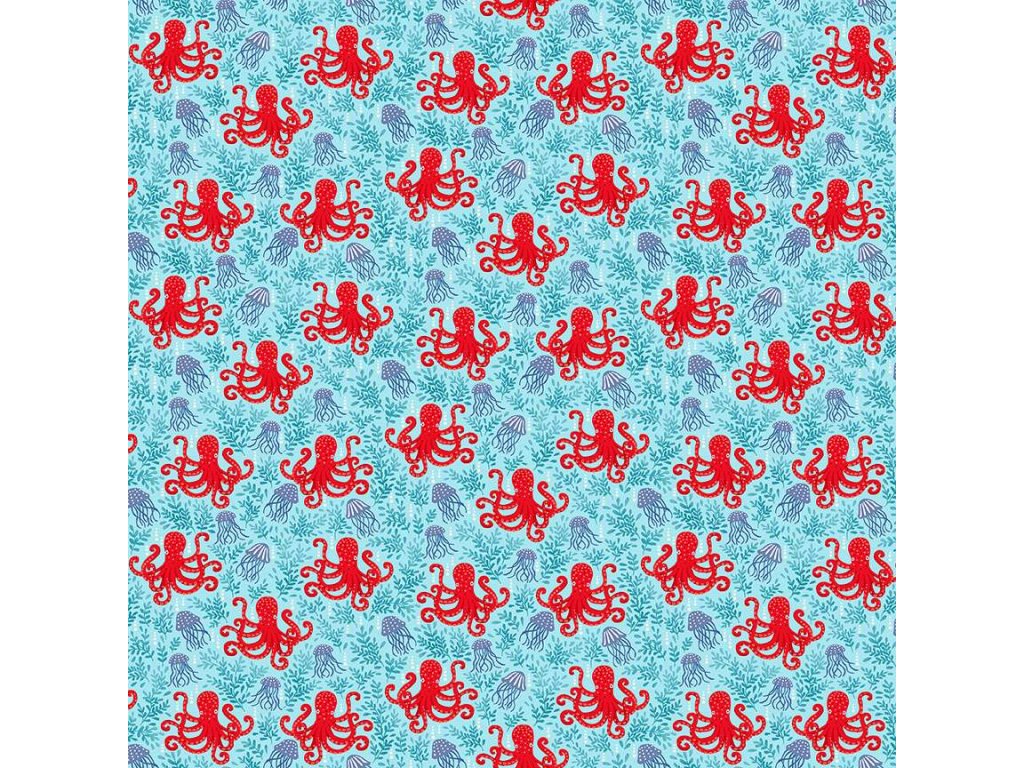 Látka s mořským motivem, vzor medúzy a červené chobotnice na světle modrém podkladu.