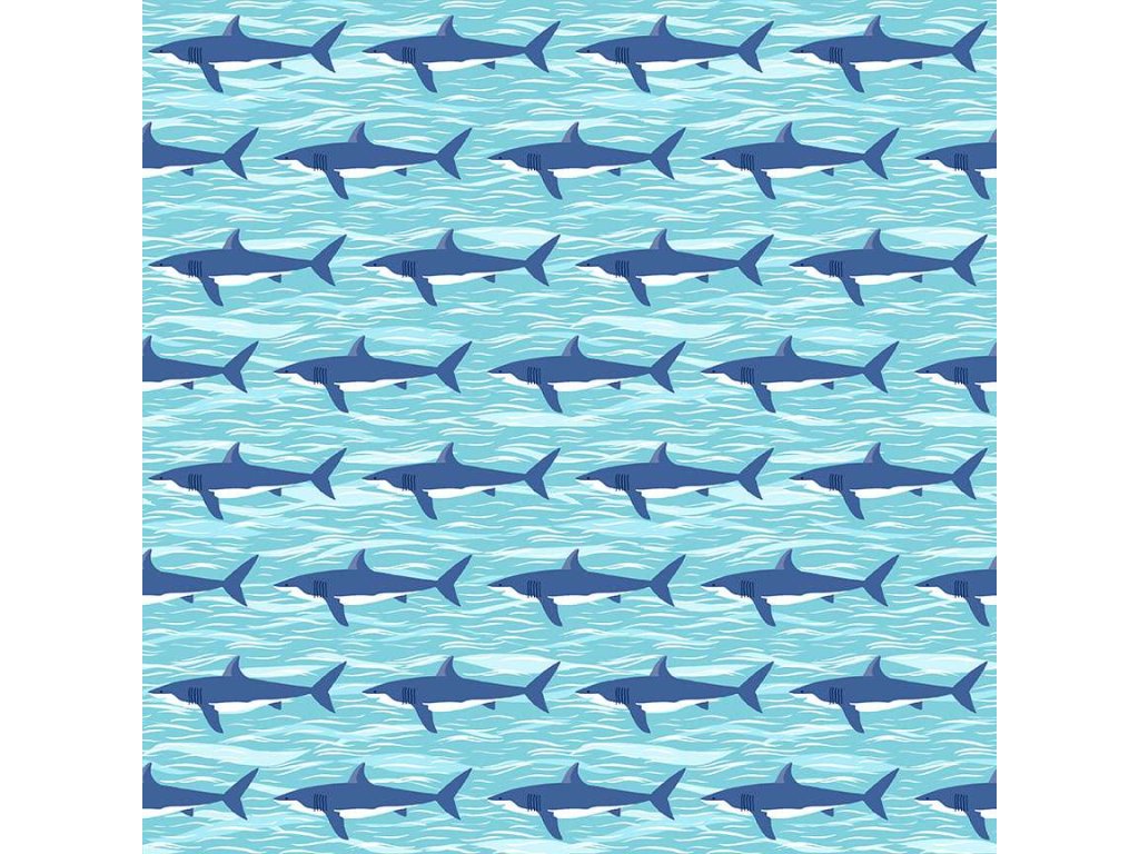 Látka s mořským motivem, vzor modrý žralok na světle modrém podkladu.