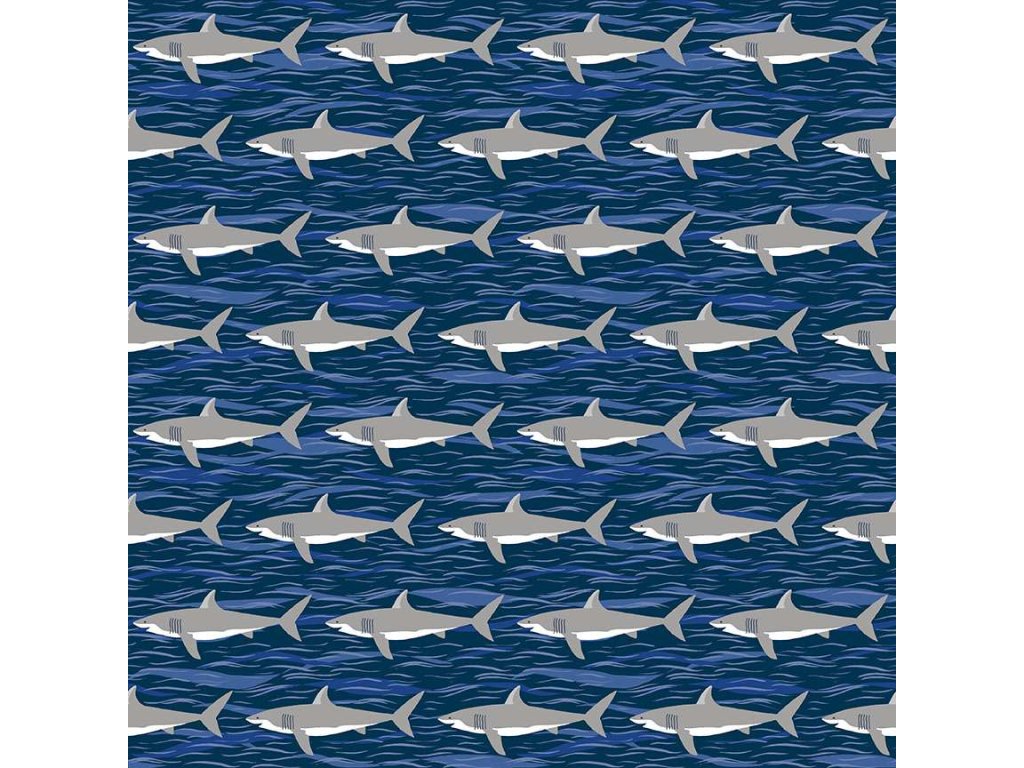 Látka s mořským motivem, vzor šedý žralok na tmavě modrém podkladu.