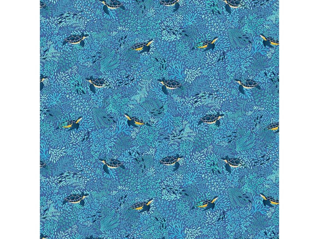 Látka s mořským motivem, vzor tmavě modré želvy na modrém podkladu.