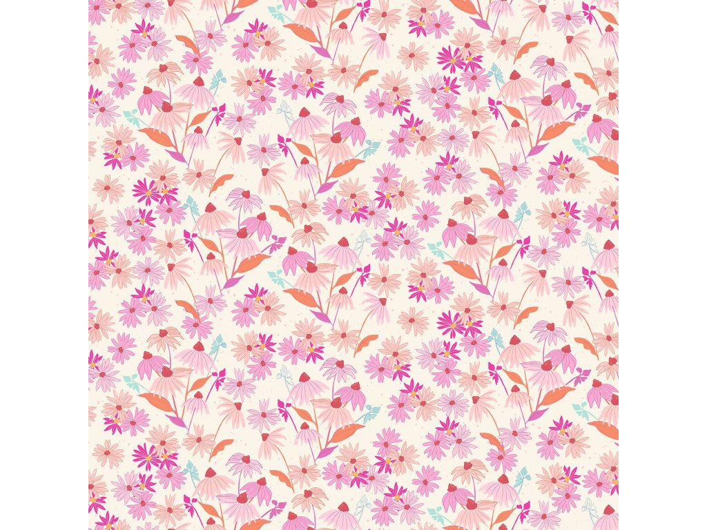 Látka s květinovým motivem, vzor echinacea na smetanovém podkladu.