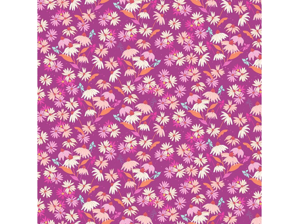Látka s květinovým motivem, vzor echinacea na tmavě růžovém podkladu.