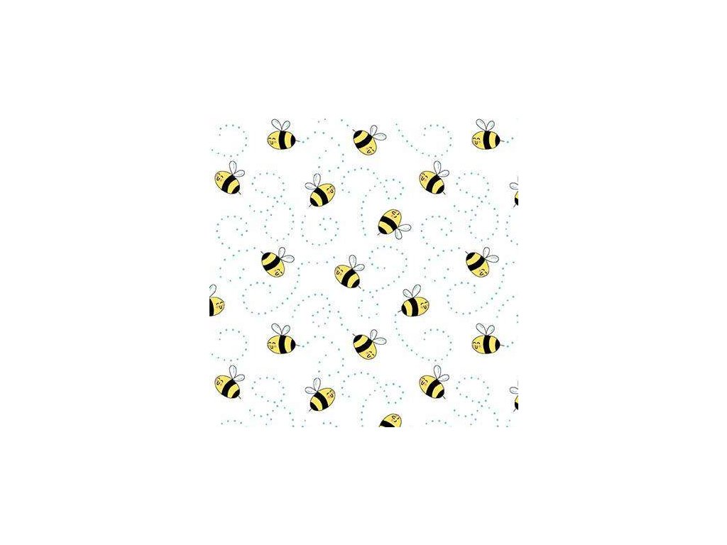 Látka s motivem včel, vzor včelky na bílém podkladu.