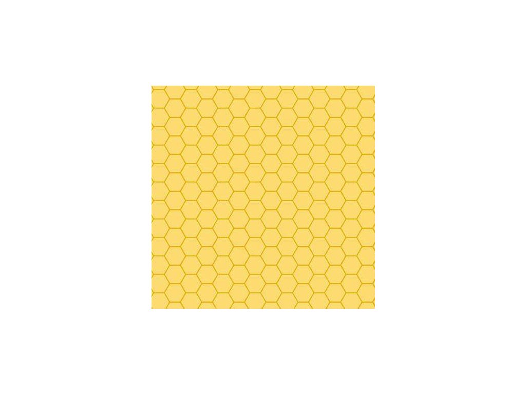 Látka s geometrickým motivem, vzor včelí plástve na žlutém podkladu.