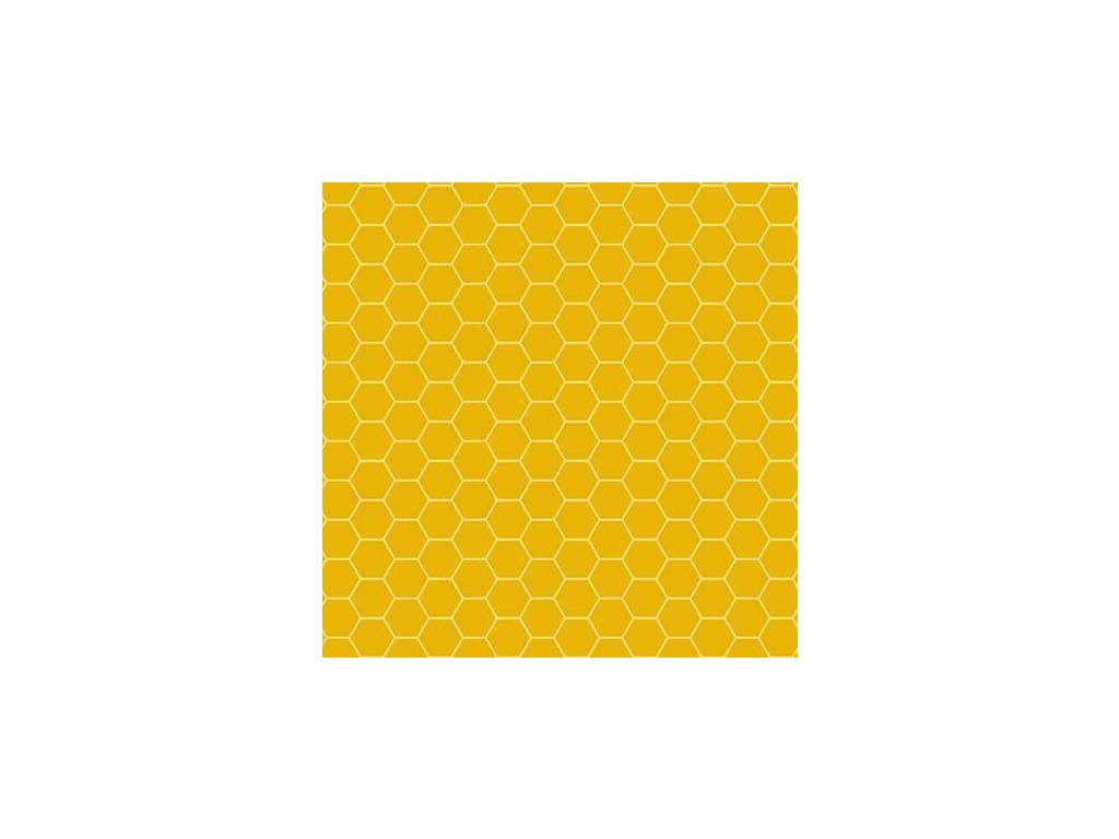 Látka s geometrickým motivem, vzor včelí plástve na tmavě žlutém podkladu.