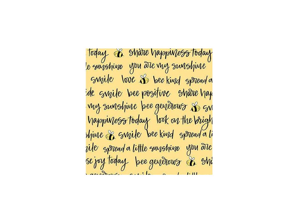 Látka s geometrickým motivem, vzor černé písmo na žlutém podkladu.