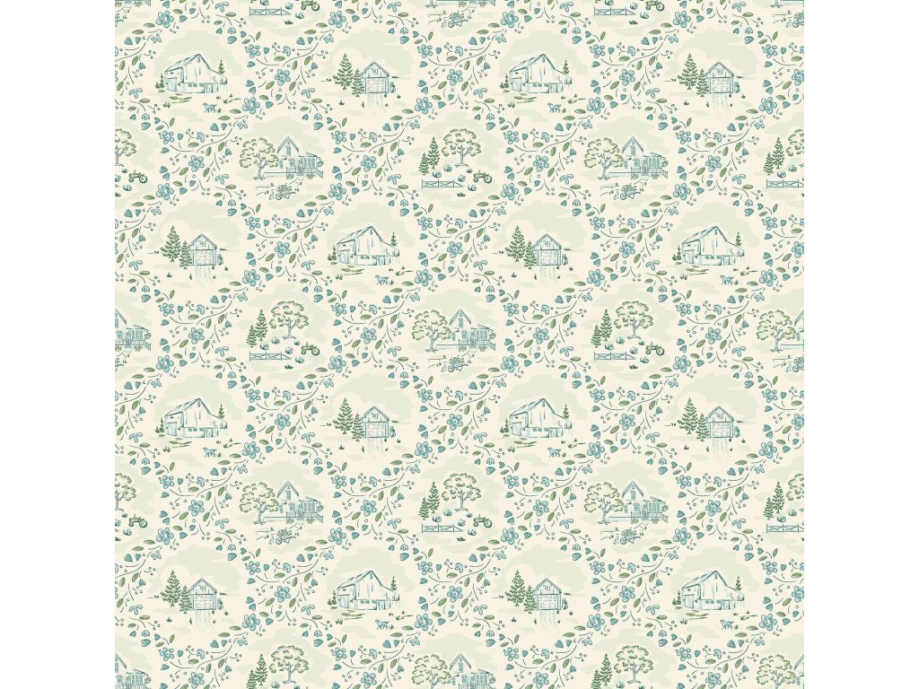 Látka s venkovským motivem, vzor farma a květiny s listy v tyrkysových a zelených odstínech na smetanovém podkladu.