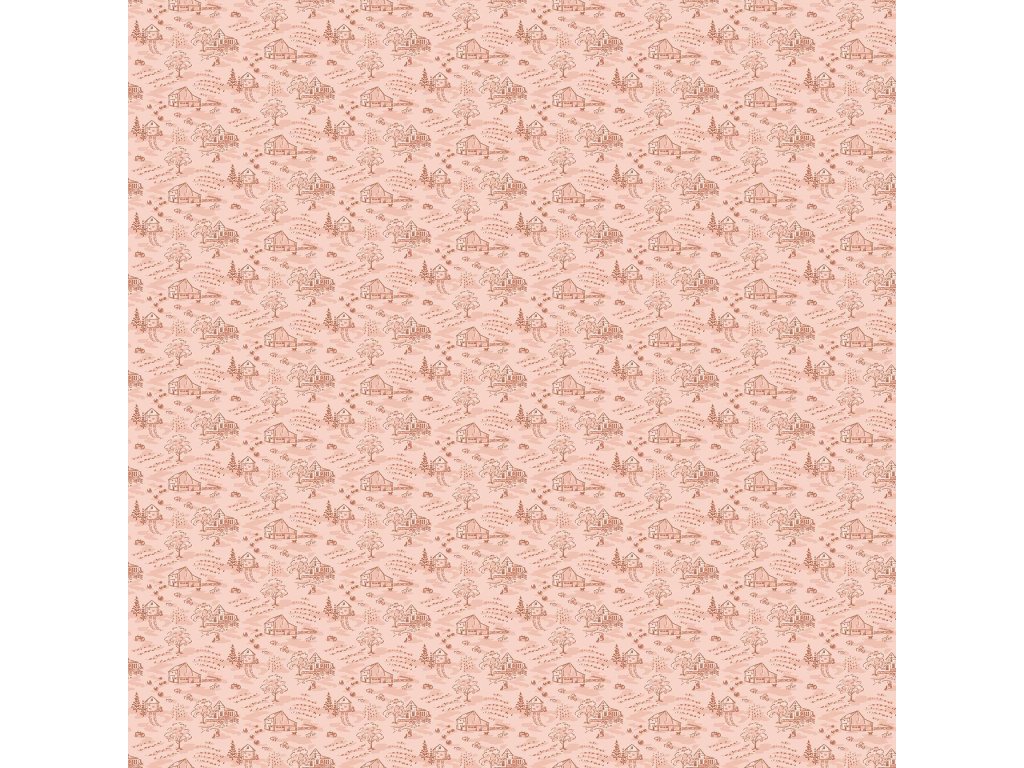 Látka s venkovským motivem, vzor krajina s farmami v tmavě červených odstínech na růžovém podkladu.