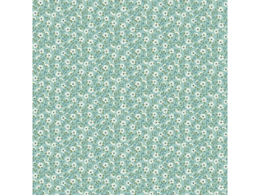Látka s květinovým motivem, vzor smetanové květiny s listy na tyrkysovém podkladu.