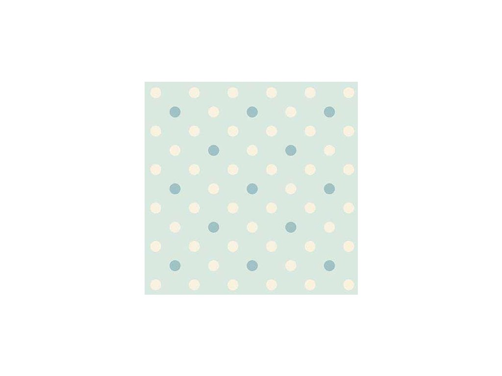 Látka s geometrickým motivem, vzor smetanový a modrý puntík na světle modrém podkladu.