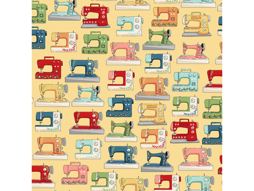 Látka s motivem šití, vzor šicí stroje na žlutém podkladu .