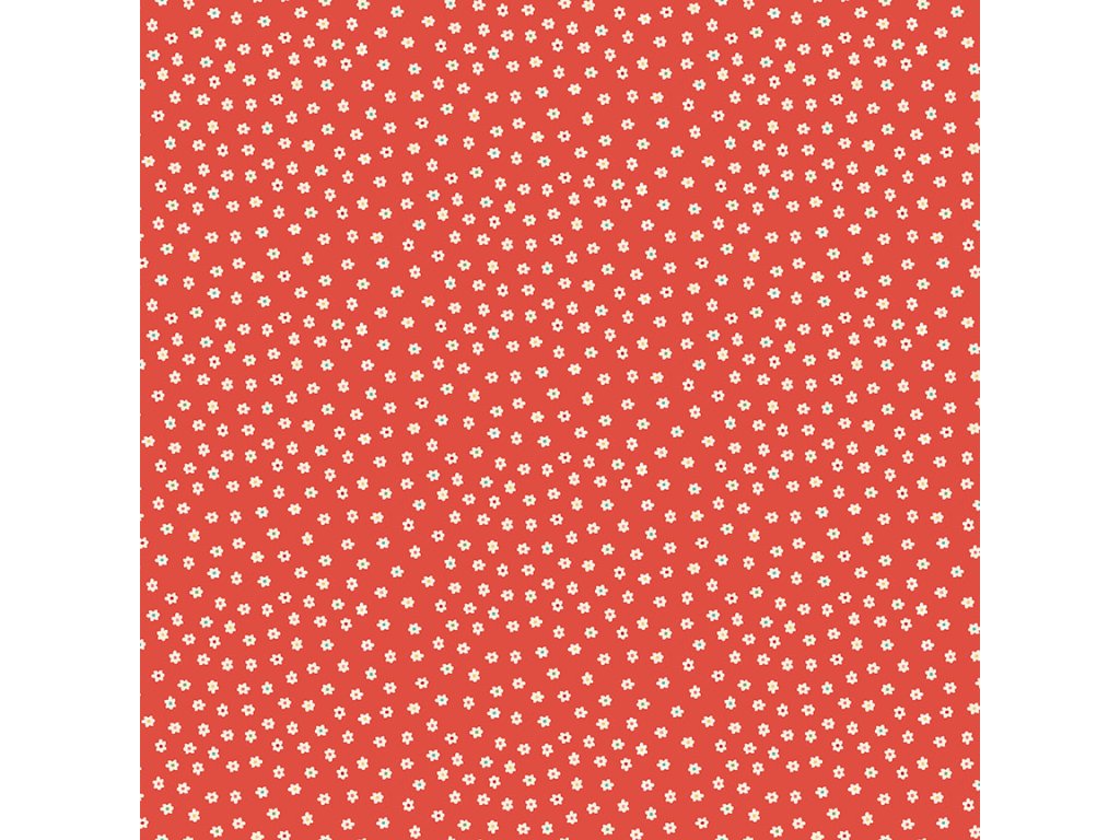 Látka s letním motivem, vzor sedmikráska na červeném podkladu .