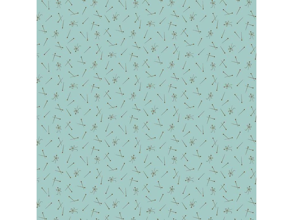 Látka s motivem šití, vzor hnědé špendlíky na tyrkysovém podkladu.
