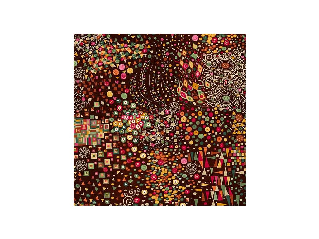 Látka s geometrickým motivem, vzor geometrické tvary se zlatým efektem na tmavě hnědém podkladu.