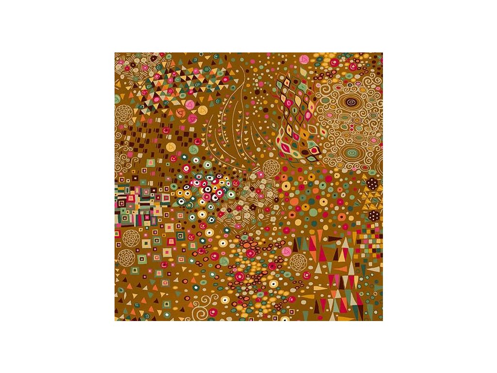 Látka s geometrickým motivem, vzor geometrické tvary se zlatým efektem na hnědém podkladu.