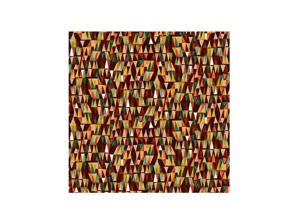Látka s geometrickým motivem, vzor trojúhelníky se zlatým efektem na tmavě hnědém podkladu.