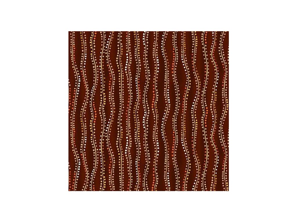 Látka s geometrickým motivem, vzor puntíky ve vlnách se zlatým efektem na tmavě hnědém podkladu.