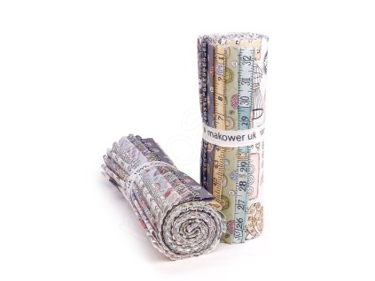 Výběr látek se vzorem šití a šicích potřeb v šedo fialových, tyrkysových, smetanových, žlutých a zelených odstínech z kolekce Atelier 12 druhů 15x55 cm. Cena za 1ks.