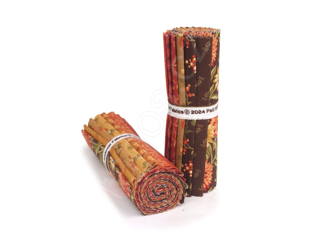 Výběr látek s podzimním vzorem v hnědých, červených a tmavě žlutých odstínech z kolekce Autumn Woods 2025 12 druhů 15x55 cm. Cena za 1ks.