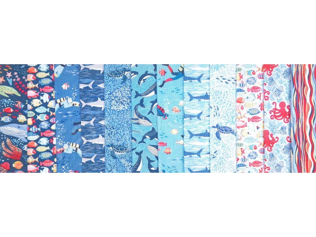 Výběr látek s mořským vzorem v modrých odstínech z kolekce Deep Blue Sea 12 druhů 15x55 cm. Cena za 1ks.