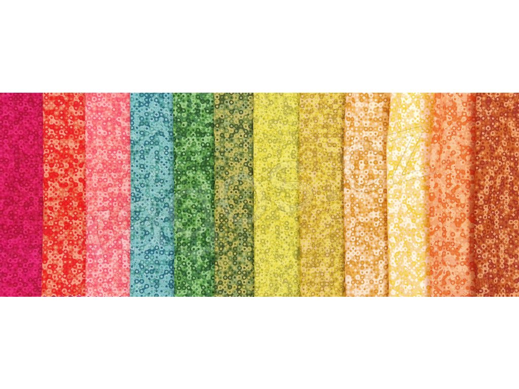 Výběr látek s geometrickým vzorem v oranžových, žlutých a zelených odstínech z kolekce Fairy Rings 12 druhů 15x55 cm. Cena za 1ks.