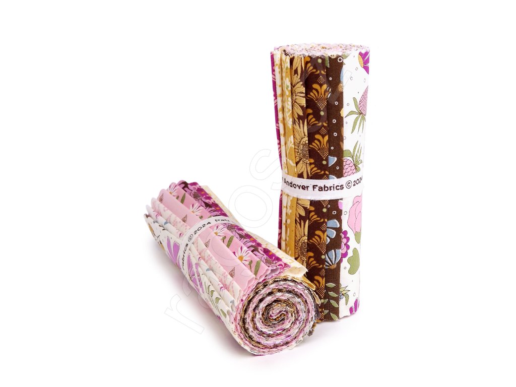 Výběr látek se vzorem květin v hnědých, žlutých, smetanových a růžových odstínech z kolekce Flourish 12 druhů 15x55 cm. Cena za 1ks.