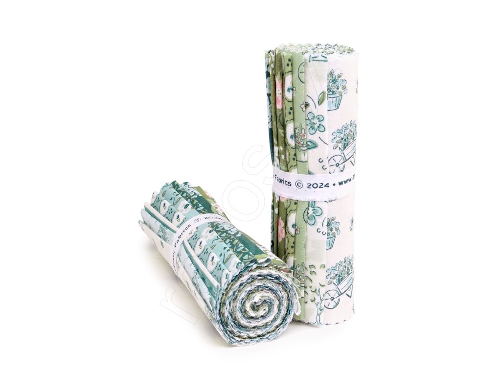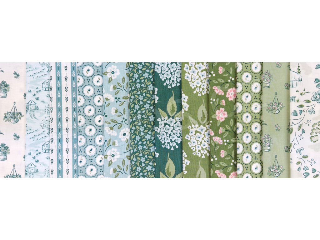 Výběr látek s venkovským a květinovým vzorem ve smetanových, modrých, tyrkysových a zelených odstínech z kolekce Heartland 12 druhů 15x55 cm. Cena za 1ks.