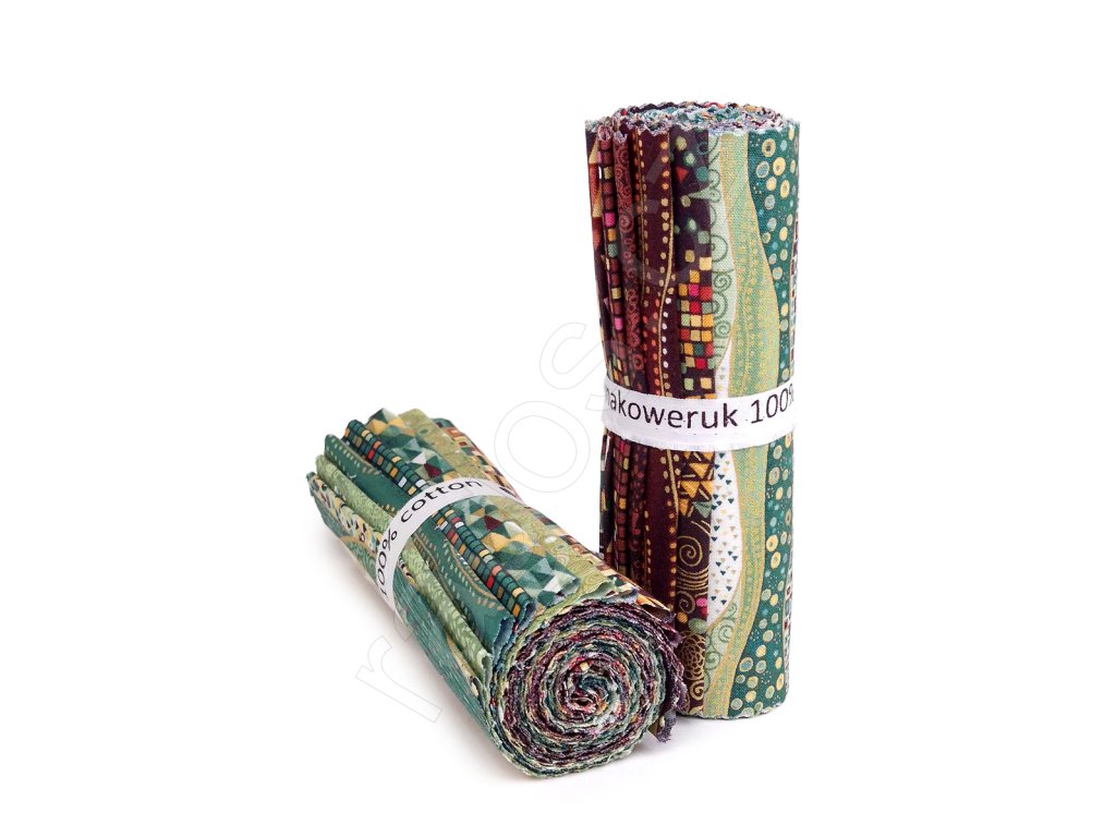 Výběr látek s geometrickým vzorem ve hnědých a zelených odstínech se zlatým efektem z kolekce Gold 12 druhů 15x55 cm. Cena za 1ks.