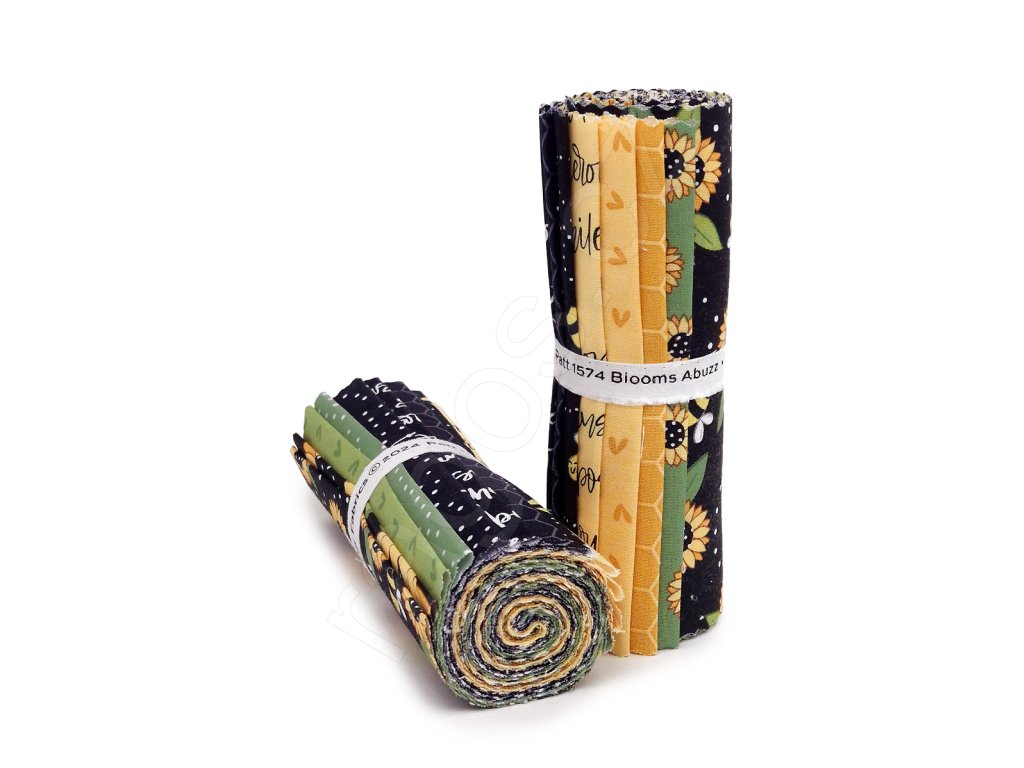Výběr látek s květinovým a geometrickým vzorem, v zelených, černých a žlutých odstínech z kolekce Sunny Honey 12 druhů 15x55 cm. Cena za 1ks.