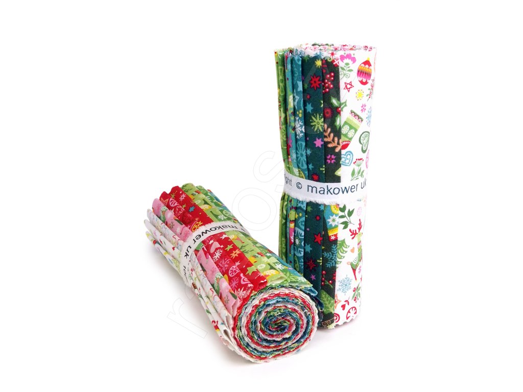 Výběr látek s vánočním vzorem v zelených, červených, smetanových a tyrkysových odstínech z kolekce Christmas Brights 12 druhů 15x55 cm. Cena za 1ks.